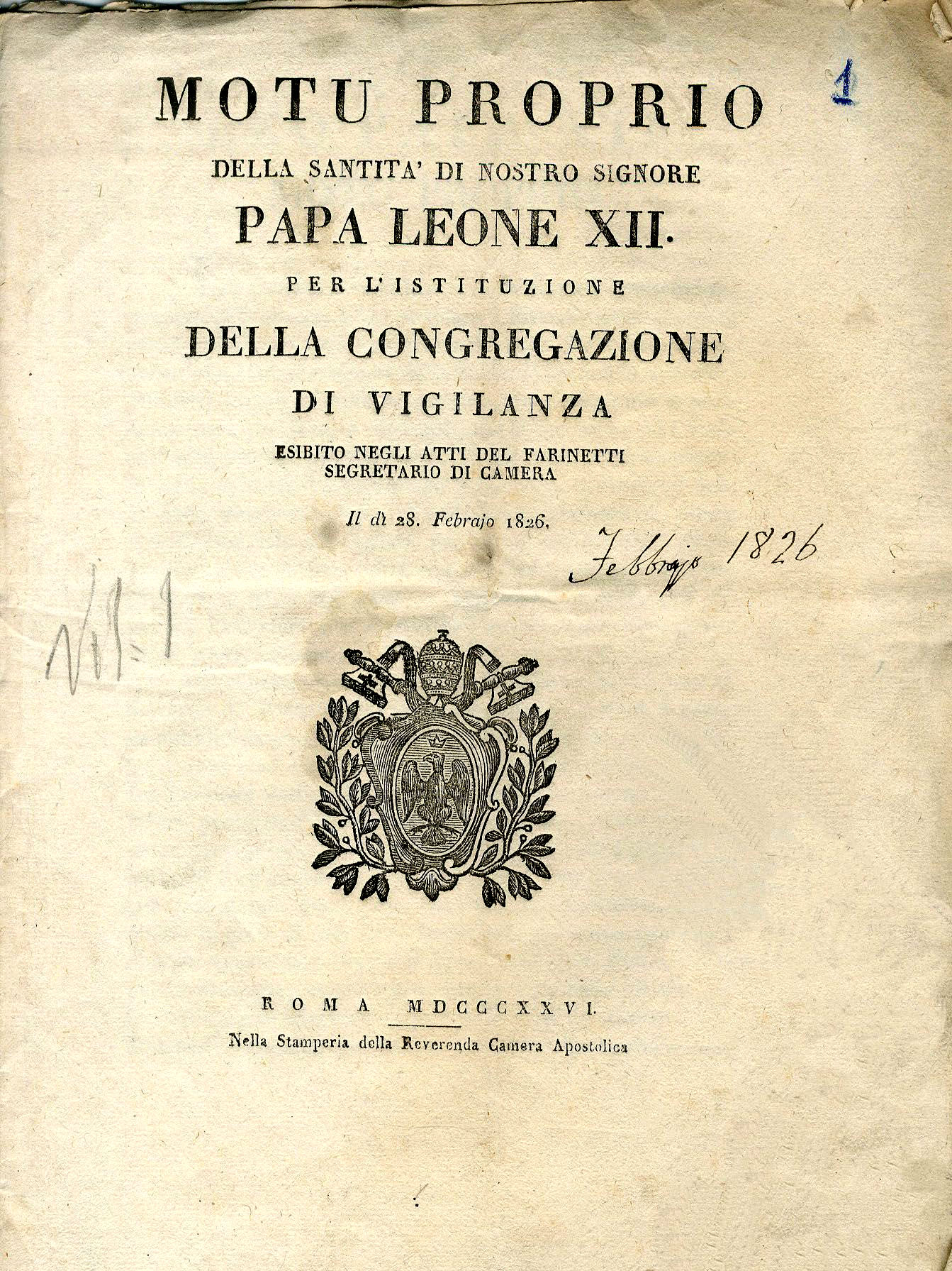 Il pontefice Leone XII (1823–1829) tornò sulla questione del riordinamento degli uffici dell'amministrazione pontificia e sui tanti problemi non risolti, con la creazione nel 1826 della Congregazione di vigilanza.