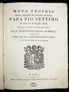 Dopo la parentesi del dominio napoleonico, lo stesso papa Pio VII, in seguito al completo recupero alla Santa Sede di tutti i territori della penisola italiana, emanò un altro importante provvedimento per la riorganizzazione della pubblica amministrazione: il motu proprio del 6 luglio 1816.