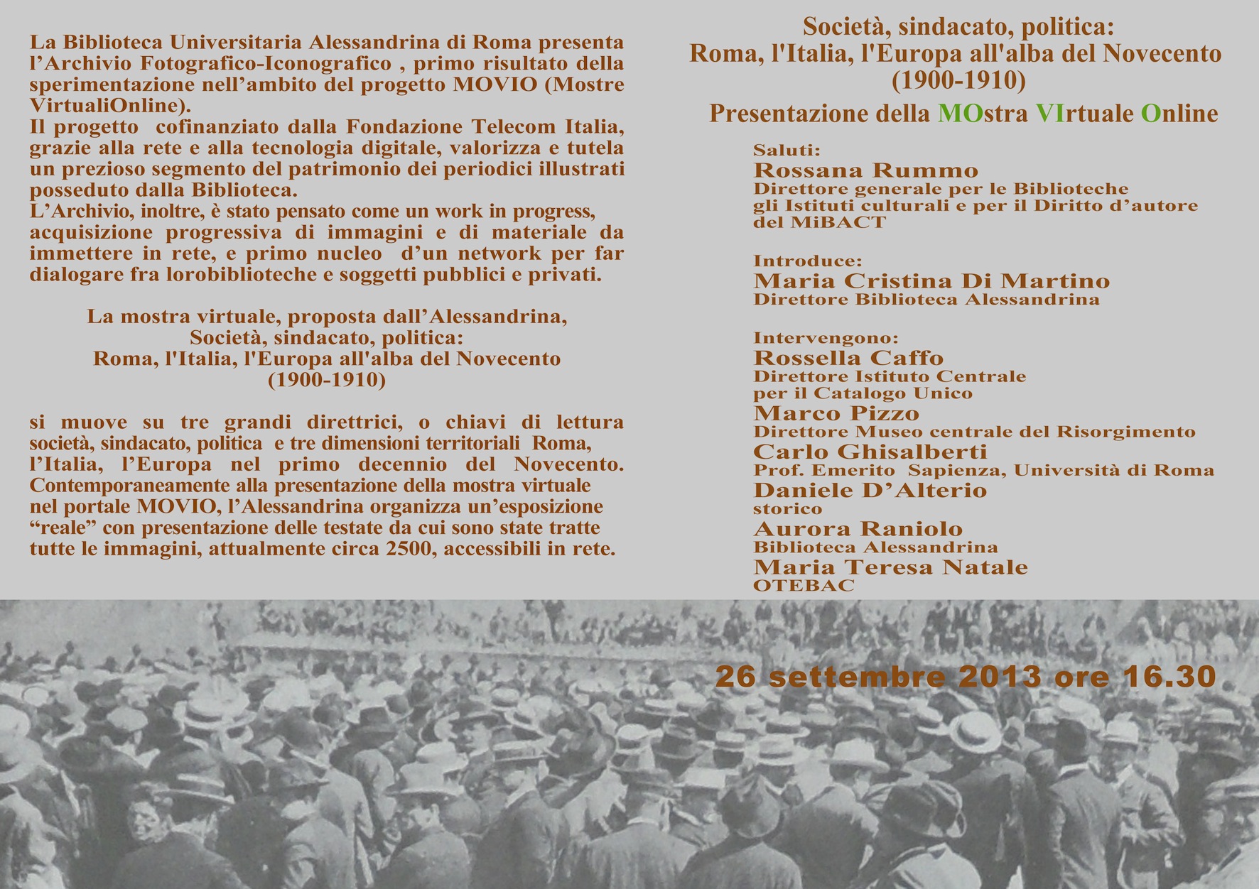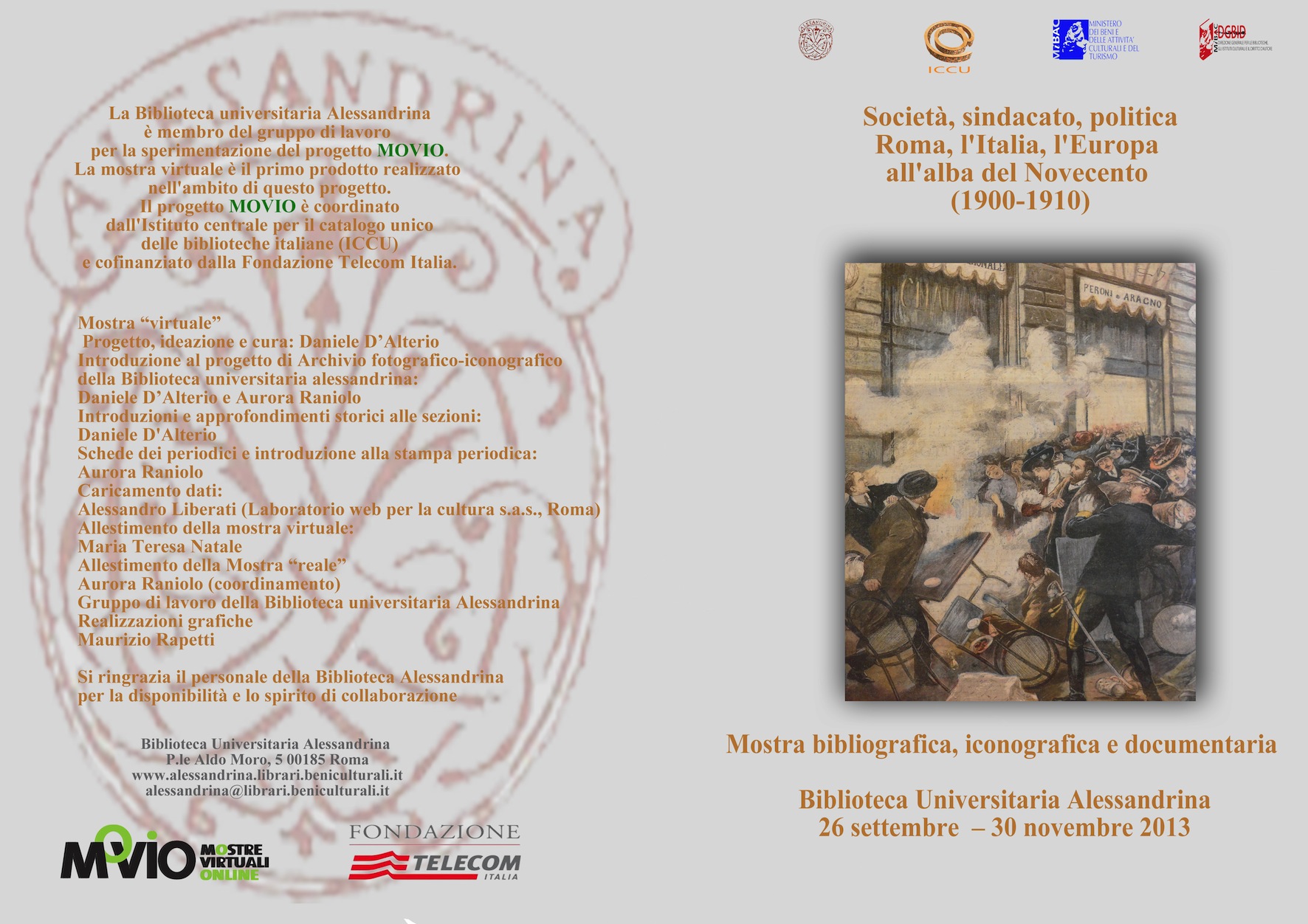 In occasione della presentazione della mostra virtuale Archivio fotografico-iconografico "Società, sindacato, politica: Roma, l'Italia e l'Europa all'alba del Novecento (1900-1910)" nell'ambito del progetto MOVIO, è stata allestita una mostra "reale" con l'esposizione di alcune annate dei periodici illustrati dai quali sono state tratte le immagini, arricchita da un corredo di foto, illustrazioni e manifesti. Alcune immagini e manifesti provengono dall'Archivio immagini Luigi Martini al quale vanno i nostri ringraziamenti per la disponibilità e la cortesia.