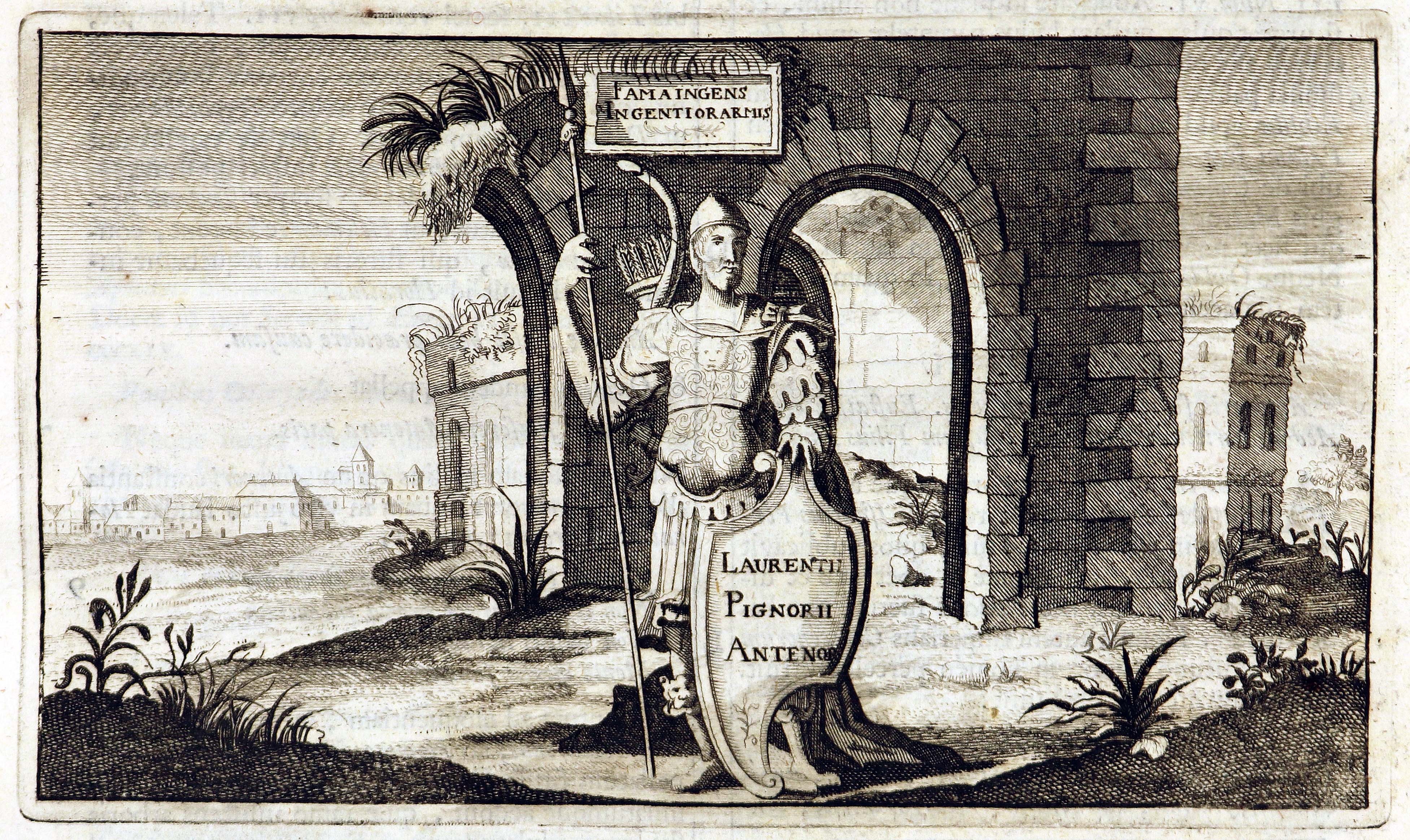 Per ribadire l’attendibilità delle Origini, il Pignoria fece uscire immediatamente una sorta di supplemento intitolato L’Antenore (il cui frontespizio reca appunto l’immagine dell’eroe fondatore davanti ai resti dell’arena romana) nonché un paio di libelli mascherati da pseudonimi.