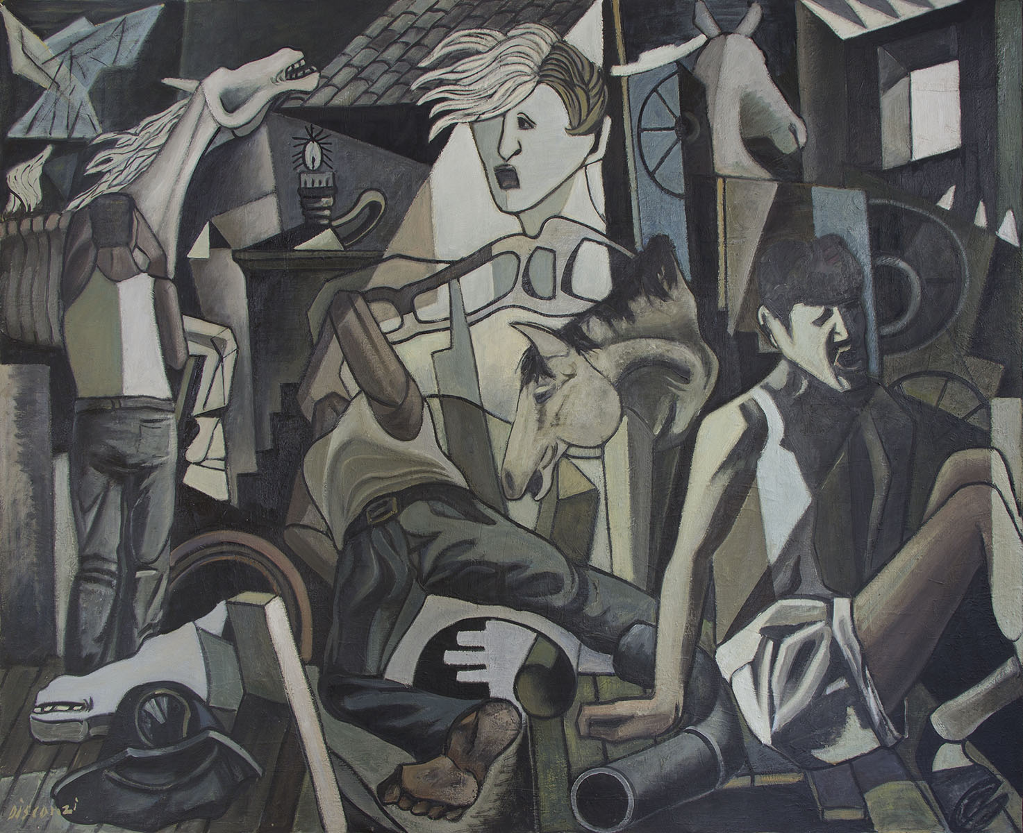 La Quadreria CGIL d Genova conserva due sue significative tele, la prima legata al periodo informale, mentre nella seconda, "Grisù a Marcinelle" Disconzi mette a frutto la lezione di Picasso, parafrasando con diverse citazioni formali la tragedia di Guernica, per rappresentare il dramma dei 262 minatori periti nel crollo della miniera belga, l'8 agosto 1956 (tra i quali 136 sono italiani), suggerendo di fatto un'analogia tra le morti sul lavoro e le vittime innocenti di tutte le guerre, sempre ingiuste.