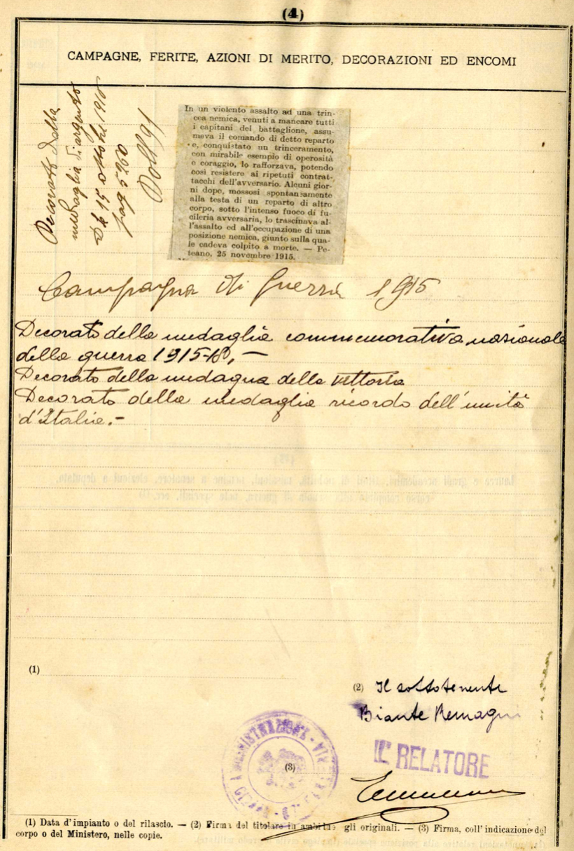 Note: Campagna di Guerra 1915; promosso Capitano dal 15 febbraio 1916 è decorato di M.A.V.M. alla memoria con Decr. Luogotenenziale 15 ottobre 1916 pag. 5260. Decorato della Medaglia commemorativa della guerra 1915-1918, della medaglia dell'Unità d'Italia e della medaglia Interalleata della Vittoria. Sepolto nel Sacrario di Redipuglia.