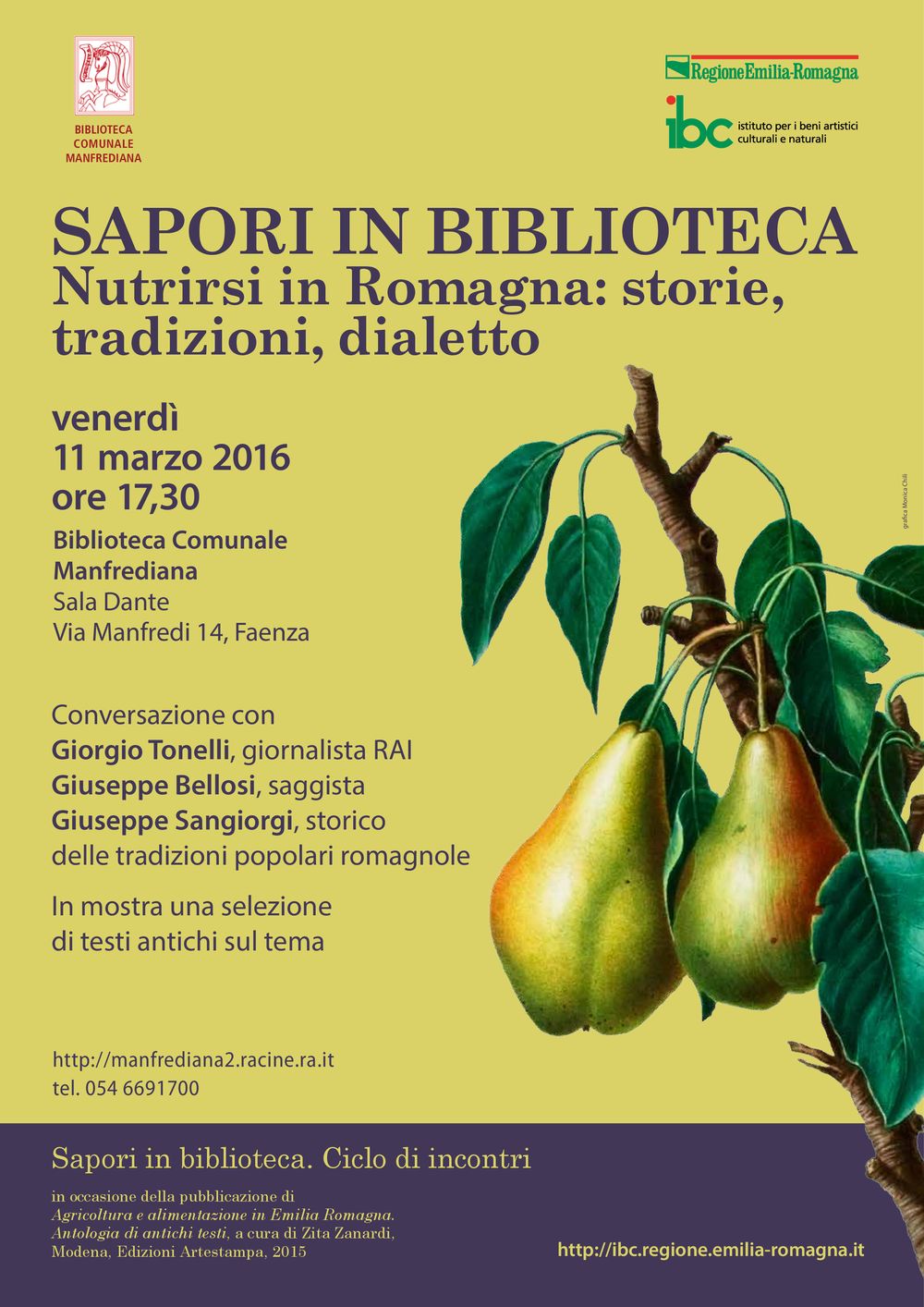 print this pageOttavo appuntamento alla Biblioteca Comunale Manfrediana di Faenza, venerdì 11 marzo, alle 17.30, del ciclo di incontri “Sapori in biblioteca” promossi in occasione della pubblicazione del volume IBC Agricoltura e Alimentazione in Emilia Romagna. Antologia di antichi testi, a cura di Zita Zanardi (collana IBC "Immagini e Documenti", Edizioni Artestampa, 2015).