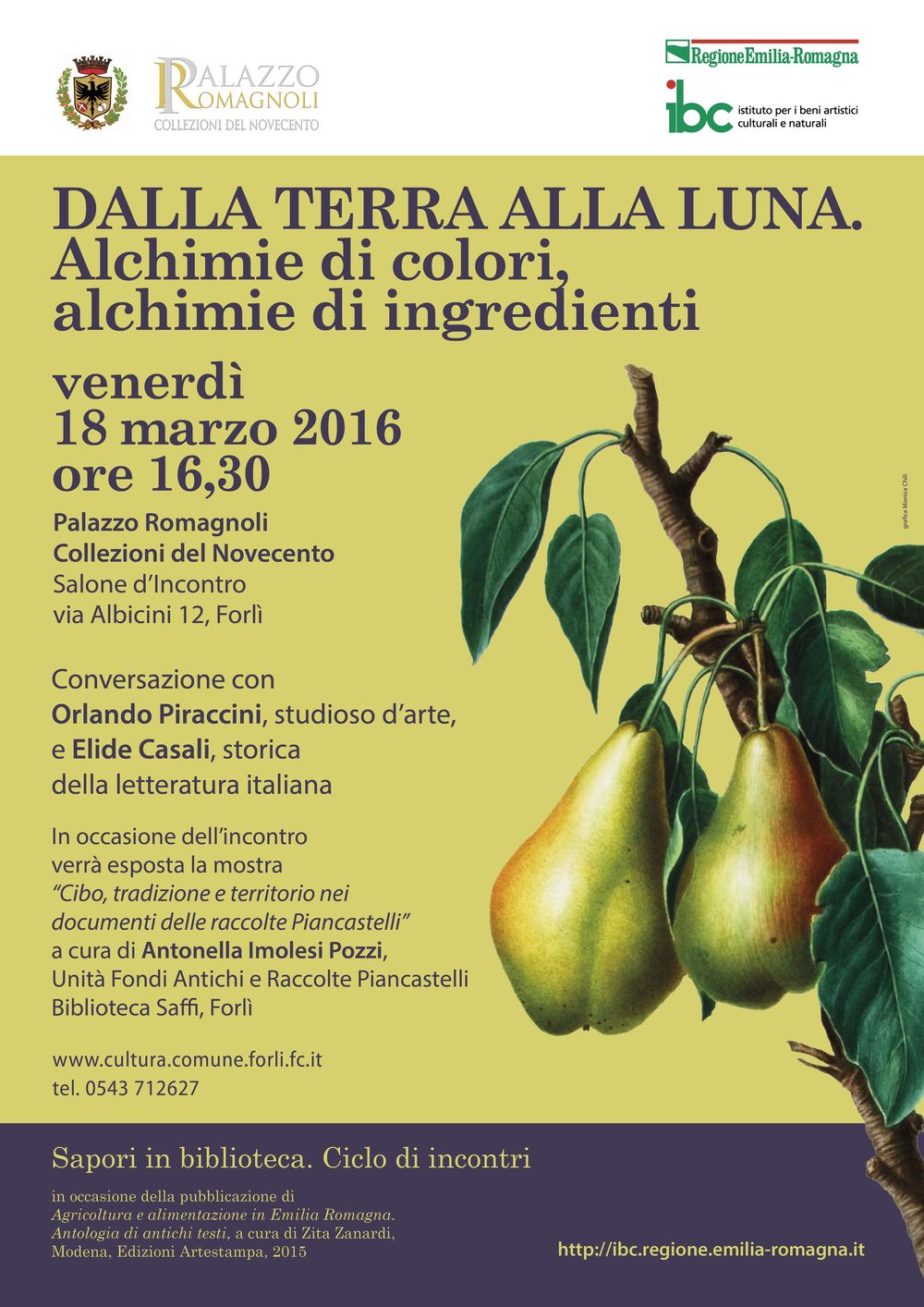 print this pageNono e ultimo appuntamento per il ciclo di incontri “Sapori in biblioteca”, venerdì 18 marzo 2016 alle 16,30, a Palazzo Romagnoli – Collezioni del Novecento di Forlì. L’iniziativa è promossa dall’Istituto per i beni culturali della Regione Emilia-Romagna in occasione della pubblicazione del volume Agricoltura e Alimentazione in Emilia Romagna. Antologia di antichi testi, a cura di Zita Zanardi (collana IBC "Immagini e Documenti", Edizioni Artestampa, 2015). Nel Salone d’incontro del Museo si tiene la conversazione dal titolo “Dalla terra alla luna”. Intervengono Orlando Piraccini, studioso d’arte, Elide Casali, storica della letteratura italiana e Antonella Imolesi Pozzi della Biblioteca comunale Saffi.