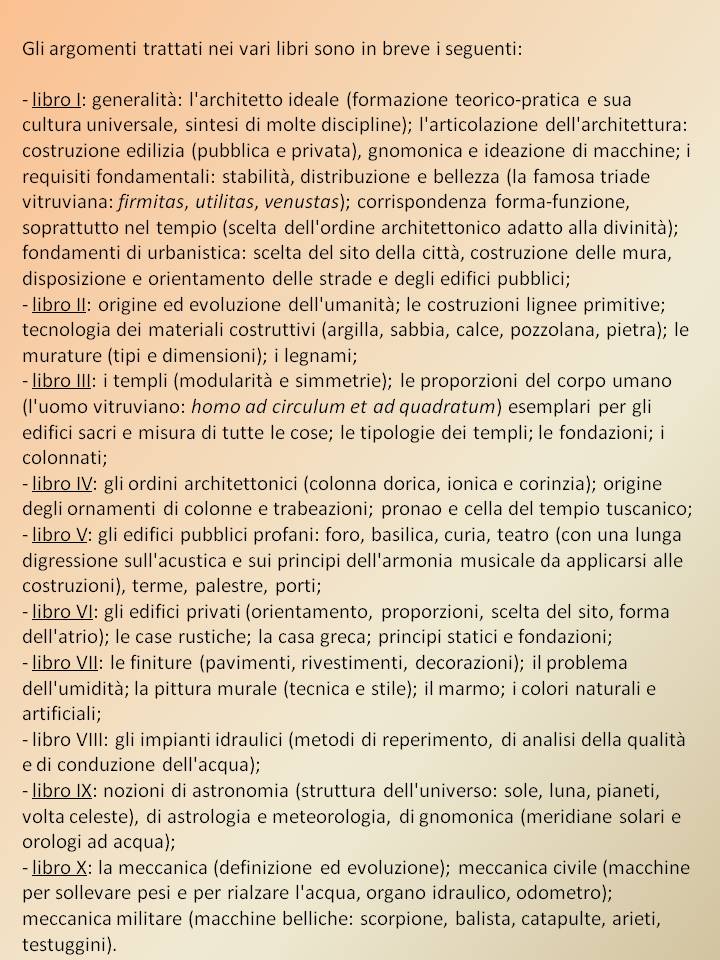 Per qualche decennio l’opera circolò manoscritta e la prima edizione latina fu data alle stampe a Roma solo nel 1486: già il De re aedificatoria di Alberti, pur altra cosa, più moderna e originale del precedente vitruviano (da cui Alberti, anzi, talora dissente), ne deriva però l’impostazione generale. Il De architectura è un trattato suddiviso in dieci libri che affrontano via via tutte le problematiche - statiche, funzionali ed estetiche - connesse con l'architettura; il linguaggio di Vitruvio, come si addice alla materia, è essenzialmente tecnico ed egli per indicare tutti gli elementi costruttivi fa uso di una terminologia specialistica, talora espressa in lingua greca. L'autore dunque, sulla base degli scritti di architettura sia greci che latini dei secoli precedenti, di alcuni scrittori romani a lui coevi (opere tutte andate in seguito perdute), e inoltre della sua personale esperienza di architetto-ingegnere, aveva compilato un trattato sistematico, in grado di offrire una formazione di base completa per gli architetti del suo tempo. Ma la sua opera avrebbe esercitato un influsso ben oltre l'antichità e particolarmente in età Carolingia, grazie alle copie redatte dagli amanuensi nei monasteri d'Europa. Di copia in copia il testo originario, già di per sé di difficile comprensione, perse però in alcune parti la sua chiarezza, anche perché ad un certo punto si tralasciò di ricopiarne i disegni illustrativi che in principio lo accompagnavano; all’impresa di chiarirne le parti ancora oscure, si era dapprima dedicata l’Accademia della Virtù, fondata a Roma dal senese Claudio Tolomei. Problemi lessicali, pur limitati al tema della casa, erano già stati affrontati con puntiglio esegetico dal letterato e poeta parmense Francesco Mario Grapaldo nel De partibus aedium libri duo pubblicato a Parma nel 1494, che godette di notevole fortuna anche in Francia e Germania. Ma per le problematiche testuali che presentava, all’inizio, più degli architetti furono i filologi a interessarsene: ad essi si devono infatti le tre edizioni a stampa quattrocentesche del testo vitruviano, dall’editio princeps romana curata da Giovanni Sulpicio da Veroli (1486/87) cui seguì la fiorentina (ma per alcuni veneziana) del 1495/96 e quella di Venezia del 1497 (in miscellanea con altri testi); ad esse seguirono nel Cinquecento quelle, di grande successo, curate da un personaggio di straordinario fascino ed estrema cultura quale fu fra' Giocondo nel 1511 (ristampata nel 1513, 1522 e 1523), il primo a porsi il problema di ricostituirne l'apparato illustrativo e correggerne il testo latino per renderlo più comprensibile; da Cesare Cesariano nel 1521, da G. B. Caporali nel 1536 e da Daniele Barbaro nel 1556 (ristampata nel 1567, 1584 e 1629). Importanti anche le edizioni francesi di J. Goujon (1547) e di C. Perrault (1673) anticipate dalle Annotationes del Filandro pubblicate nel 1544 (qui documentate dal solo commento del 1545 e nella ristampa del 1586). Poi la sfida attirò nel corso del Quattrocento anche alcuni architetti di grande levatura, cioè Leon Battista Alberti, Francesco di Giorgio Martini e Filarete, che ne presero esempio per le loro opere, edifici e trattati, rendendo così la conoscenza approfondita di quest'opera, un compito imprescindibile per ogni architetto al passo coi tempi. | Struttura Leggi il De Architectura |