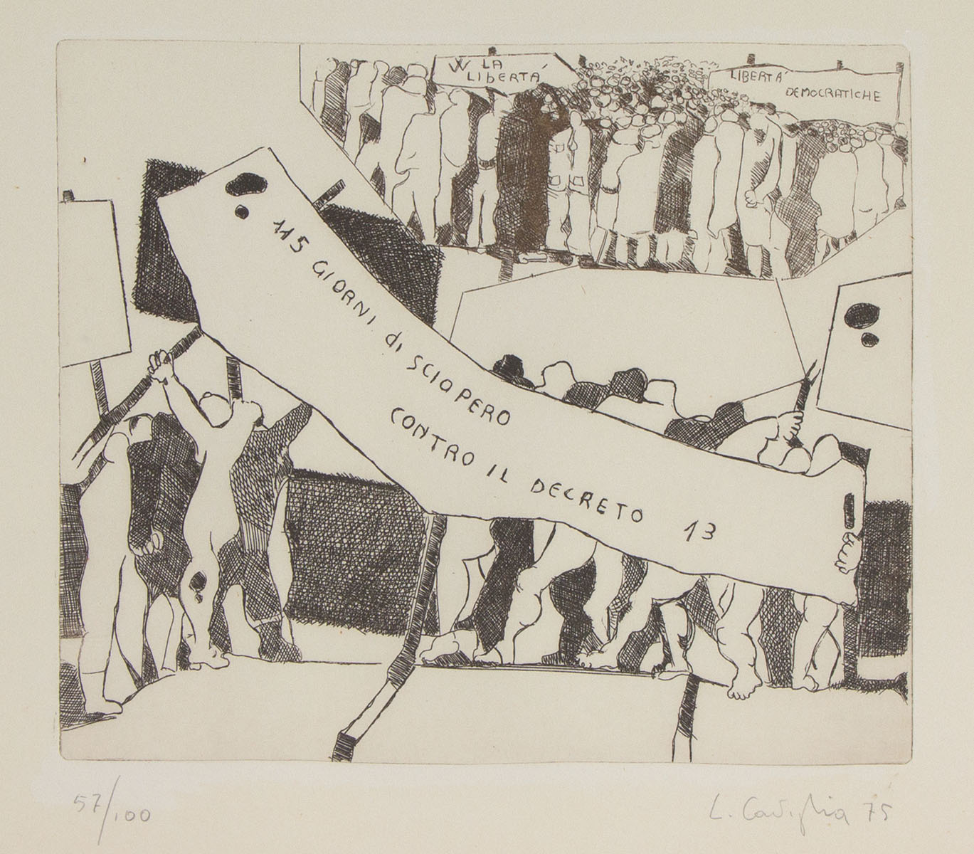 Alterttanto enigmatiche e indefinite, la serie di figure dai volumi sfumati o tratteggiati a seconda della tecnica utilizzata. Oltre alle opere pittoriche, la collezione comprende un'opera grafica dedicata allo storico sciopero del 1955 dei lavoratori del Ramo Portuale di Genova, contro il Decreto 13 che favoriva la "libera scelta" degli imprenditori a discapito della storica Compagnia. L'incisione, realizzata nel 1975, appartiene a un ciclo di opere realizzate da più artisti in occasione del ventesimo anniversario dello sciopero durato 123 giorni.