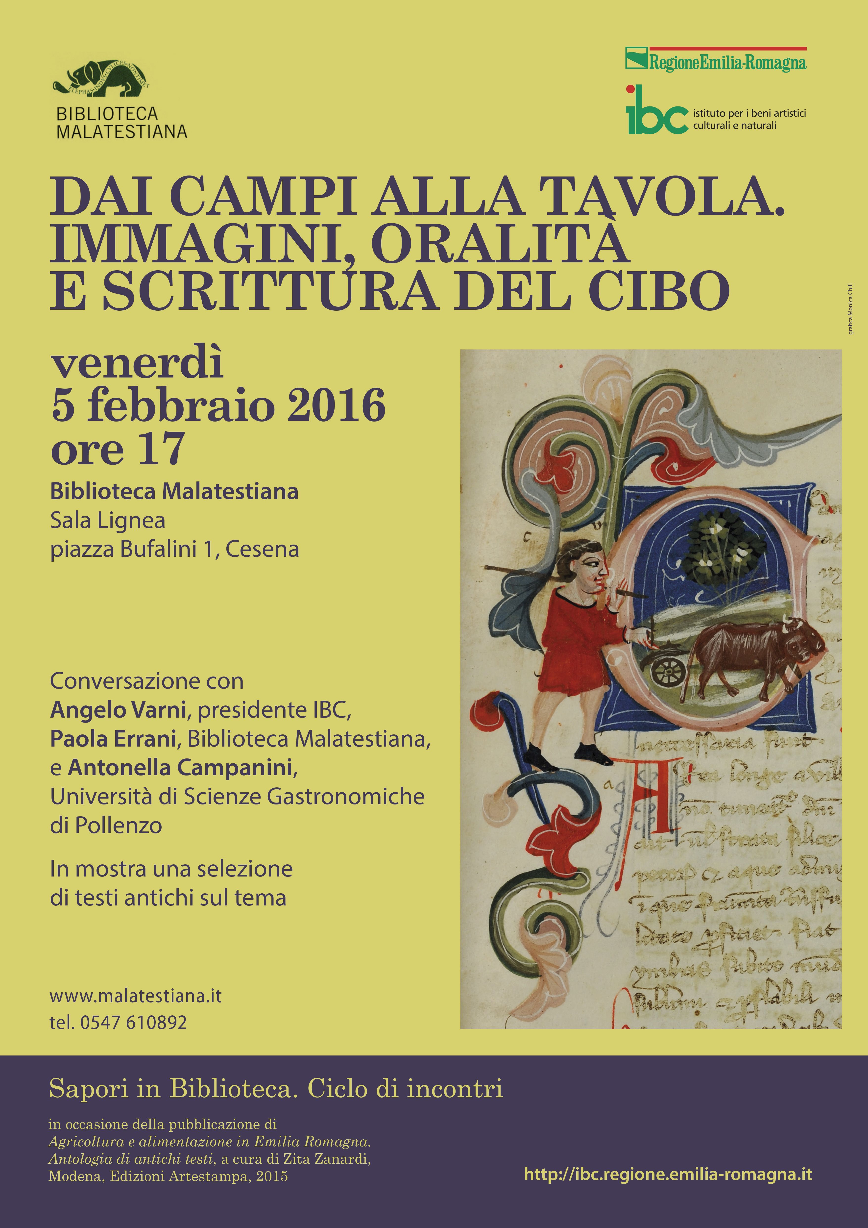 print this pageQuinto appuntamento del ciclo di incontri “Sapori in biblioteca” venerdì 5 febbraio 2016 alle 17,00 presso la Biblioteca Malatestiana a Cesena. La rassegna è promossa dall’Istituto per i beni culturali della Regione Emilia-Romagna in occasione della pubblicazione del volume Agricoltura e Alimentazione in Emilia Romagna. Antologia di antichi testi, a cura di Zita Zanardi (collana IBC "Immagini e Documenti", Edizioni Artestampa, 2015).