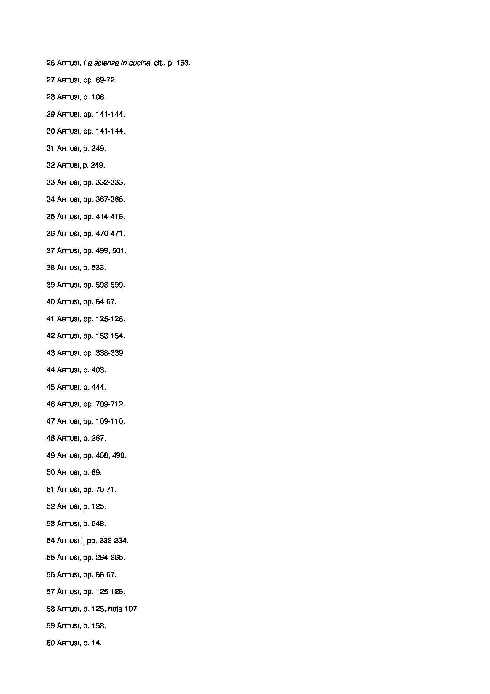 Si tratta soltanto di spigolature, nella Scienza in cucina si potrebbe trovare molto altro. Sono tuttavia sufficienti per mostrare che Artusi non ha scritto “soltanto” un libro di cucina, che pure non sarebbe poco, ma un’opera molto più ampia che gli permette di rientrare a pieno titolo nelle glorie italiane a cui l’Emilia-Romagna ha dato i natali. La scrittura della cucina, della quale è considerato tuttora, per l’Italia, il maestro indiscusso, lo lascia tuttavia quantomeno perplesso. «Il miglior maestro è la pratica sotto un’esercente capace», scrive nel suo Prefazio, e poco prima aveva messo in guardia i lettori dalla cucina scritta: «Diffidate dei libri che trattano di quest’arte: sono la maggior parte fallaci o incomprensibili». Eppure, «con una scorta simile a questa mia, mettendovi con molto impegno al lavoro, potrete, io spero, annaspar qualche cosa». 60 La cucina orale vince comunque ma, finalmente, anche quella messa per iscritto, e non solo per le corti ma per un pubblico vasto, ha acquisito espressamente autonomia e dignità.