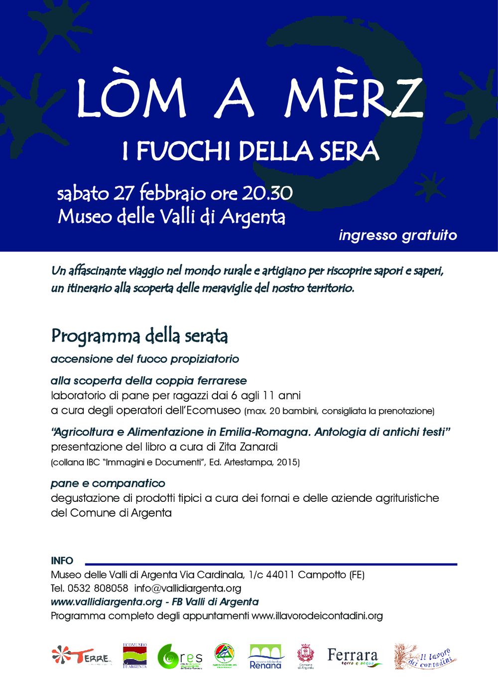 print this pageSabato 27 febbraio 2016, alle 20.30, nell'ambito della manifestazione "Lòm a Mêrz", si è svolta a Campotto, nel Museo delle Valli di Argenta, la presentazione del volume Agricoltura e alimentazione in Emilia Romagna - Antologia di antichi testi a cura di Zita Zanardi. Nel corso della serata è stato attivato per i bambini un laboratorio del pane.