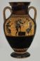 Su un lato è raffigurato Ercole, adulto e già accolto tra gli dei, che suona la cetra, appoggiandosi con la gamba su un piccolo altare. Ad ascoltarlo, a destra, la dea Atena sua protettrice, riconoscibile dall’elmo, e, a sinistra, il dio Hermes, con gli inconfondibili calzari alati. Sull’altro lato del vaso, ritorno a casa di uno dei Dioscuri con Leda e Tindaro.
